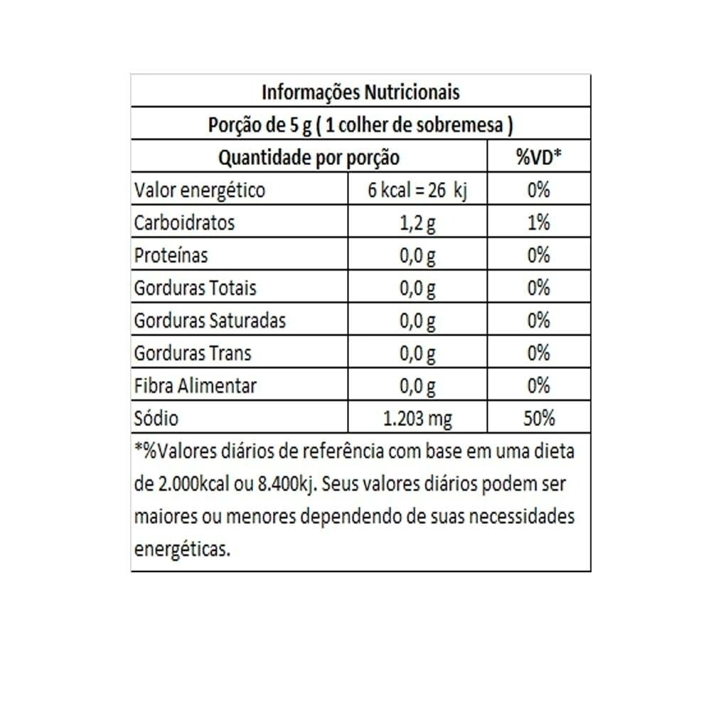Ingredientes: Produto para caldo de bacon (Contém Aromatizante Sintético Identico ao natural), sal refinado, creme de milho (Bacillus thuringiensis, Streptomyces viridochromogenes, Agrobacterium thumefaciens, Sphingobium herbicidorovansm, Zea Mays(, alho, salsa, alpo, pimenta branca, cebola, louro, açúcar, realçador de sabor glutamato monossódico INS 621, umectante dióxido de silício INS 551, corante caramelo 150d, aromatizante aroma sintético idêntico ao natural de bacon.