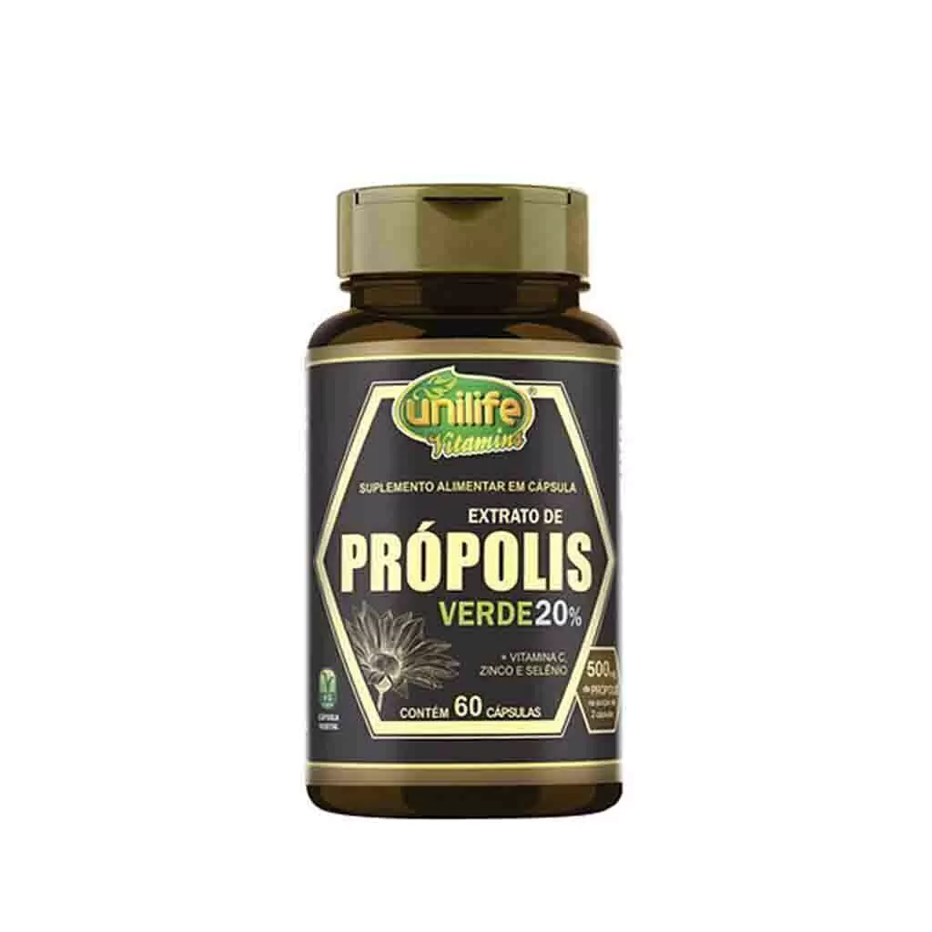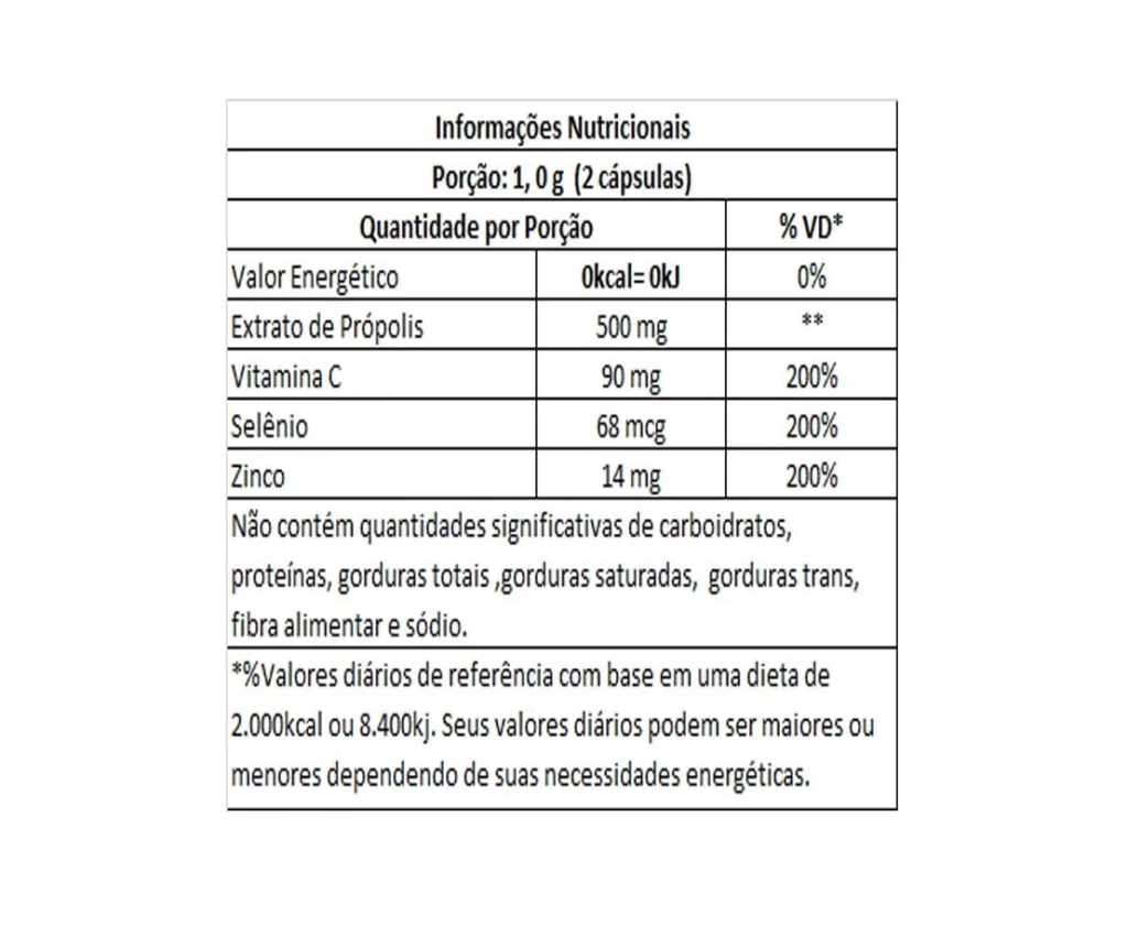 Ingredientes: Extrato de própolis 20%, ácido ascórbico, bisglicinato de zinco, selenometionina, antiumectantes: silicato de magnésio, estearato de magnésio e dióxido de silício.