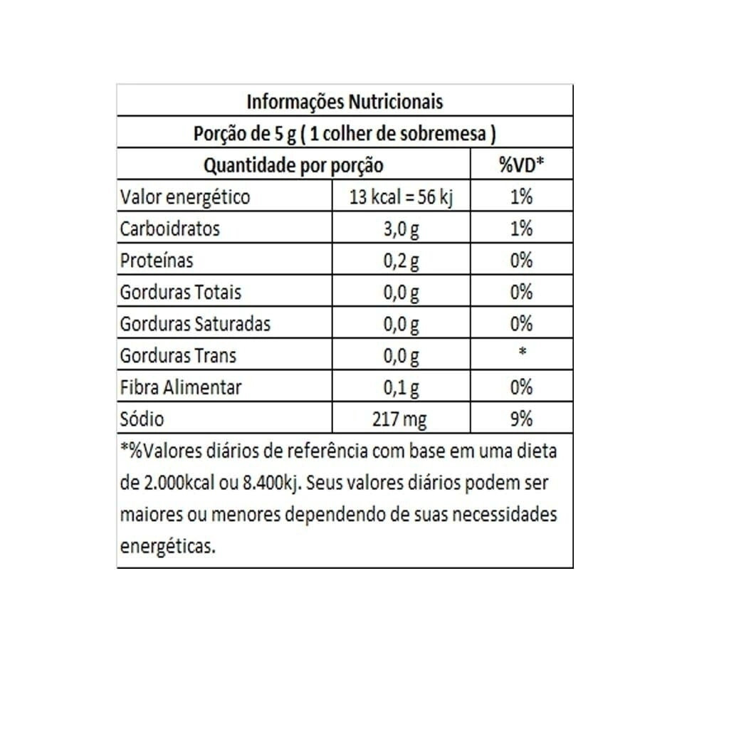 Ingredientes: Creme de milho (Bacillus thuringiensis, Streptomyces viridochromogenes, Agrobacterium thumefaciens, Zea Mays), cebola, sal, açúcar, salsa, cebolinha, tomilho, estragão, realçador de sabor glutama monossódico INS 621, acidulante ácido cítrico INS 330, aroma idêntico ao natural de limão e corante cúrcuma INS 100.